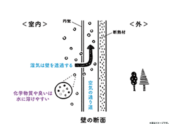 透湿性の壁材が、湿気と一緒にホルムアルデヒドや生活臭なども屋外へ。