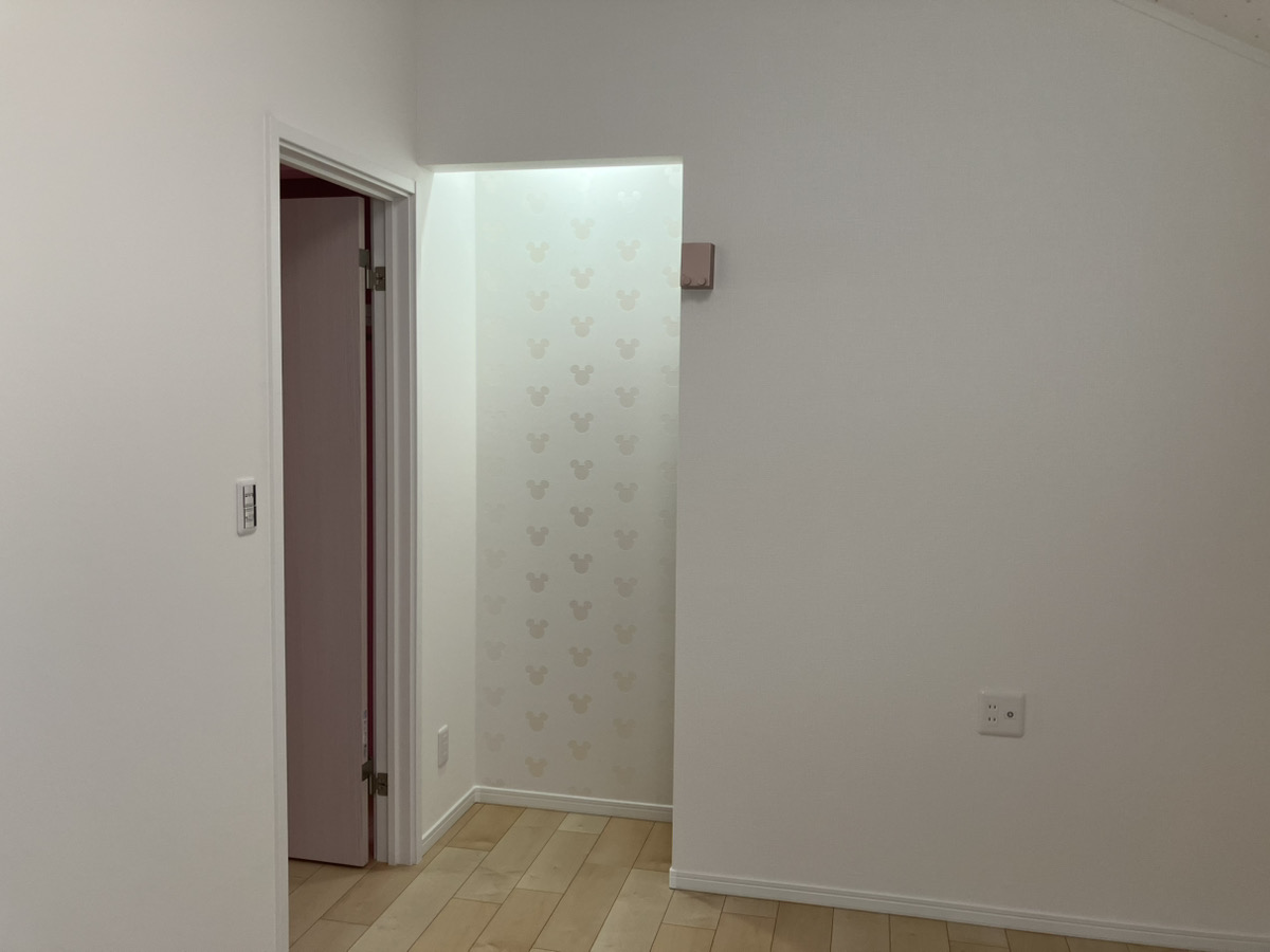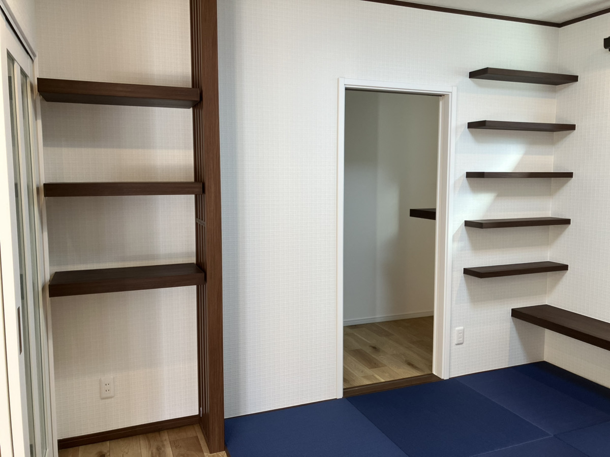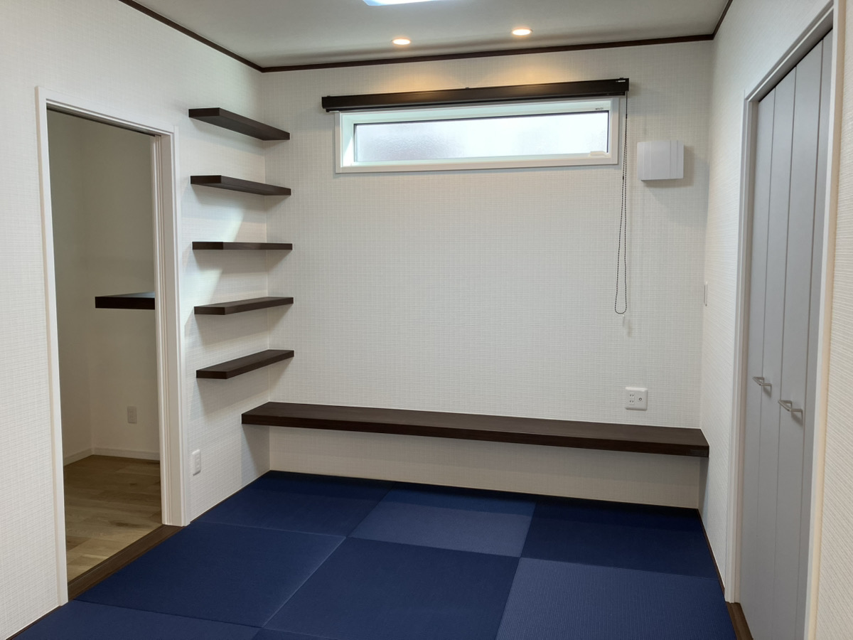 壁面の棚と造作ベンチを組み合わせた和室は、ちょっとしたくつろぎスペースやお子様の遊び場にもぴったり。隣室とのつながりも意識した開放的な空間です。
