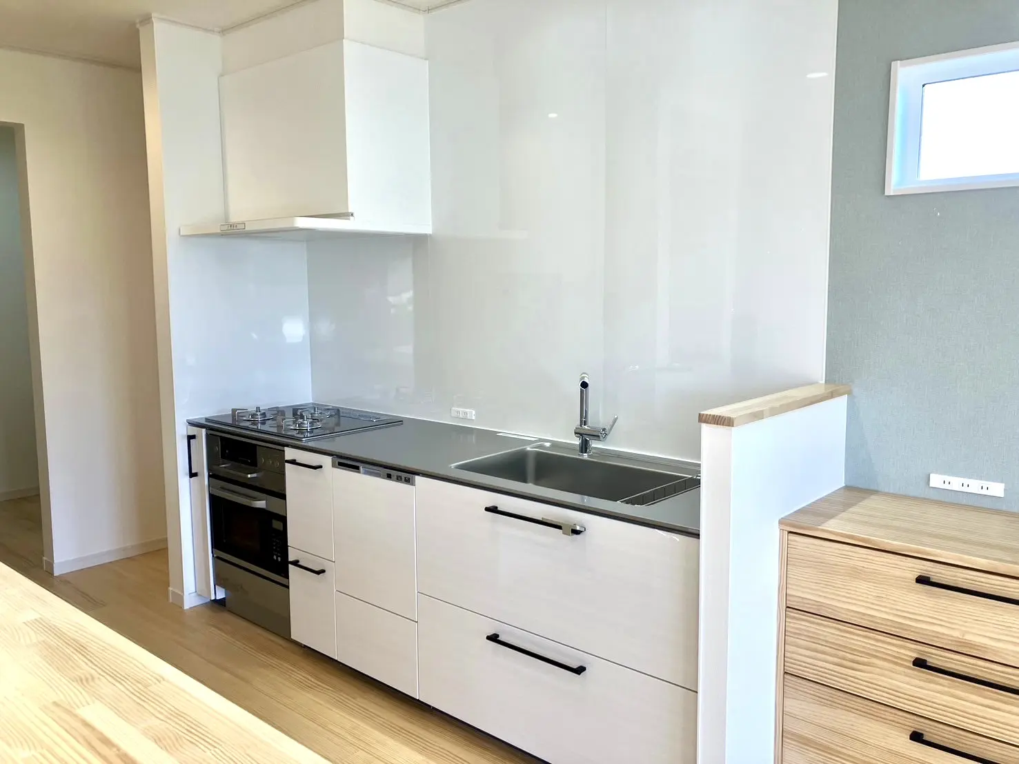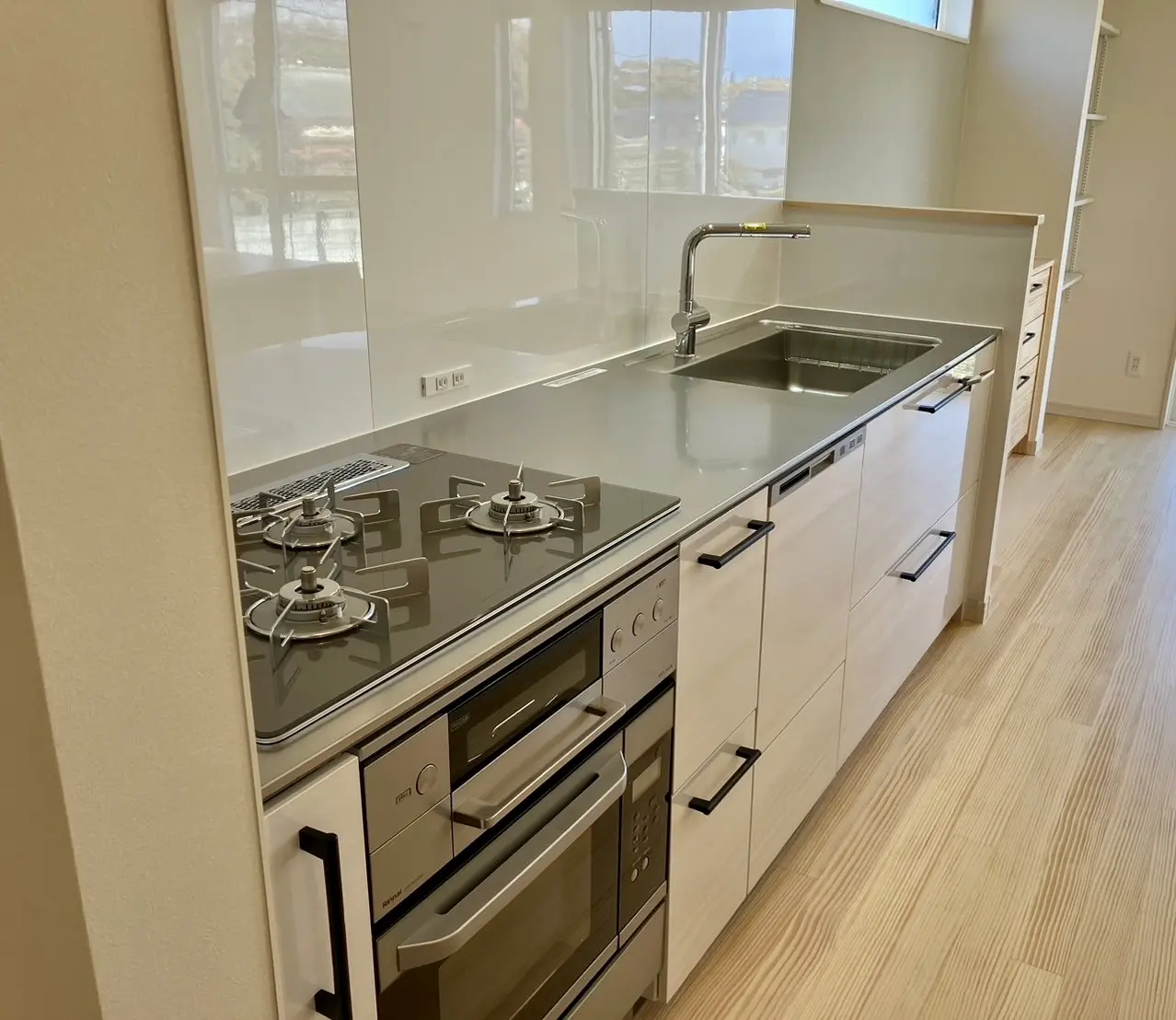 横移動だけで調理から片付けまでが完結する、ストレスの少ない動線設計です。