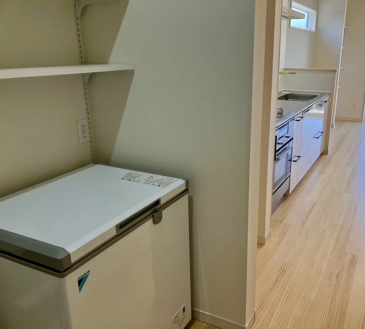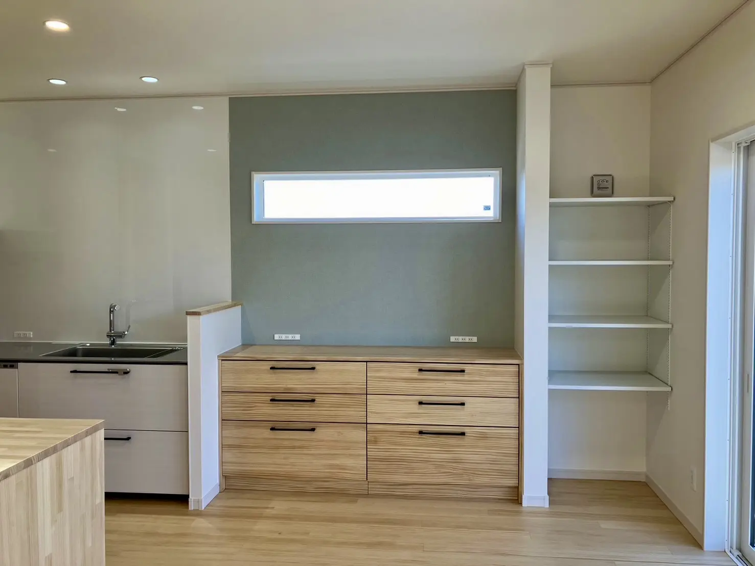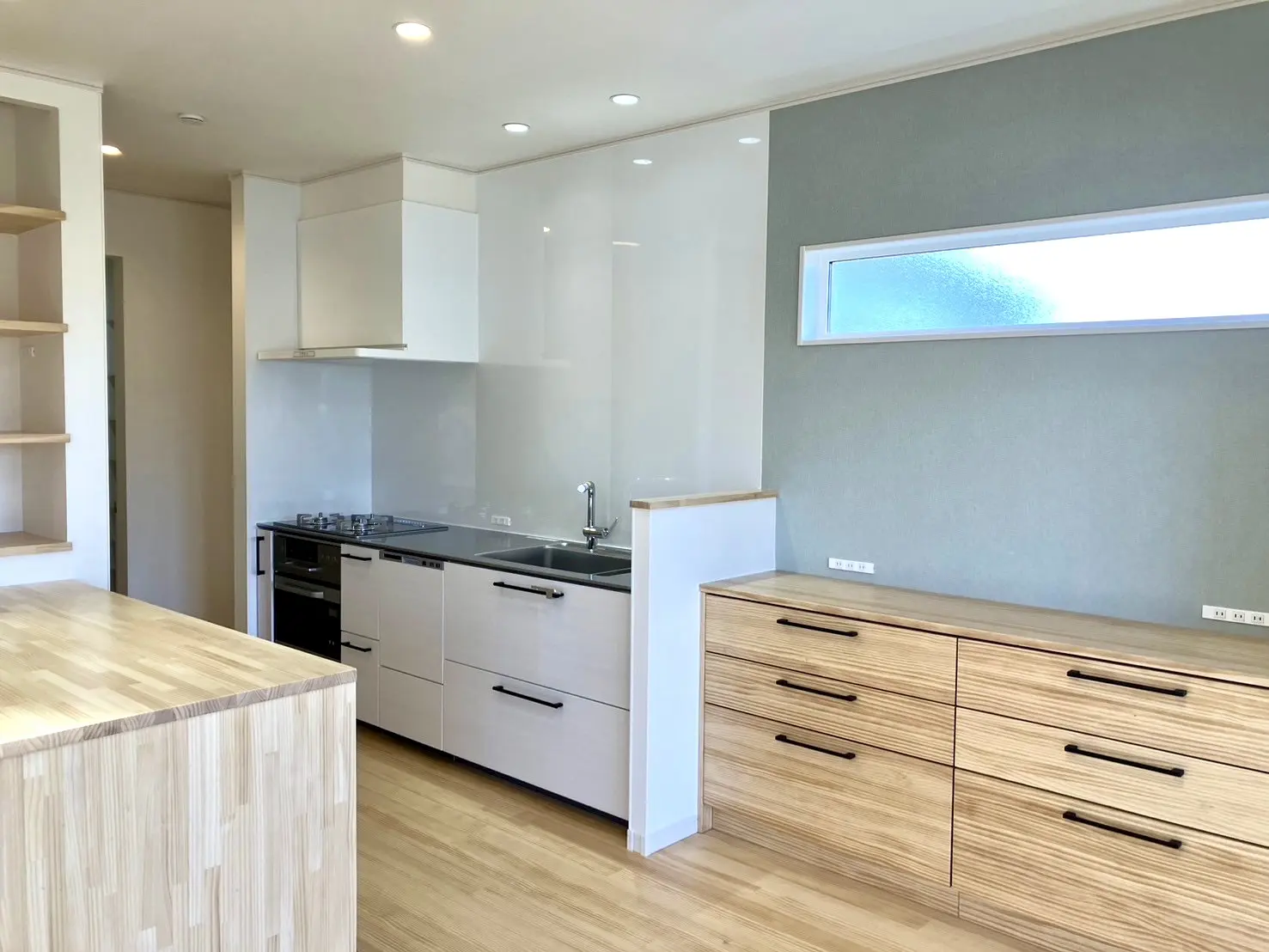 キッチンの背面には、たっぷり収納できるカウンター収納と可動棚を配置。