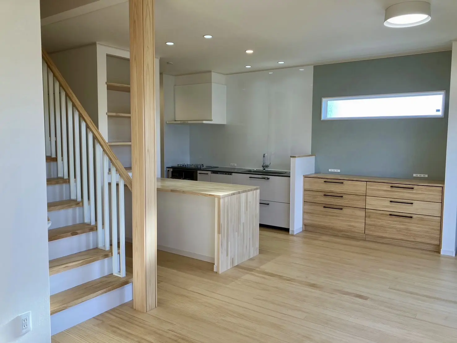 無垢調のフローリングと木目の造作がやさしく、家族が自然と集まりたくなるような雰囲気に仕上がっています。