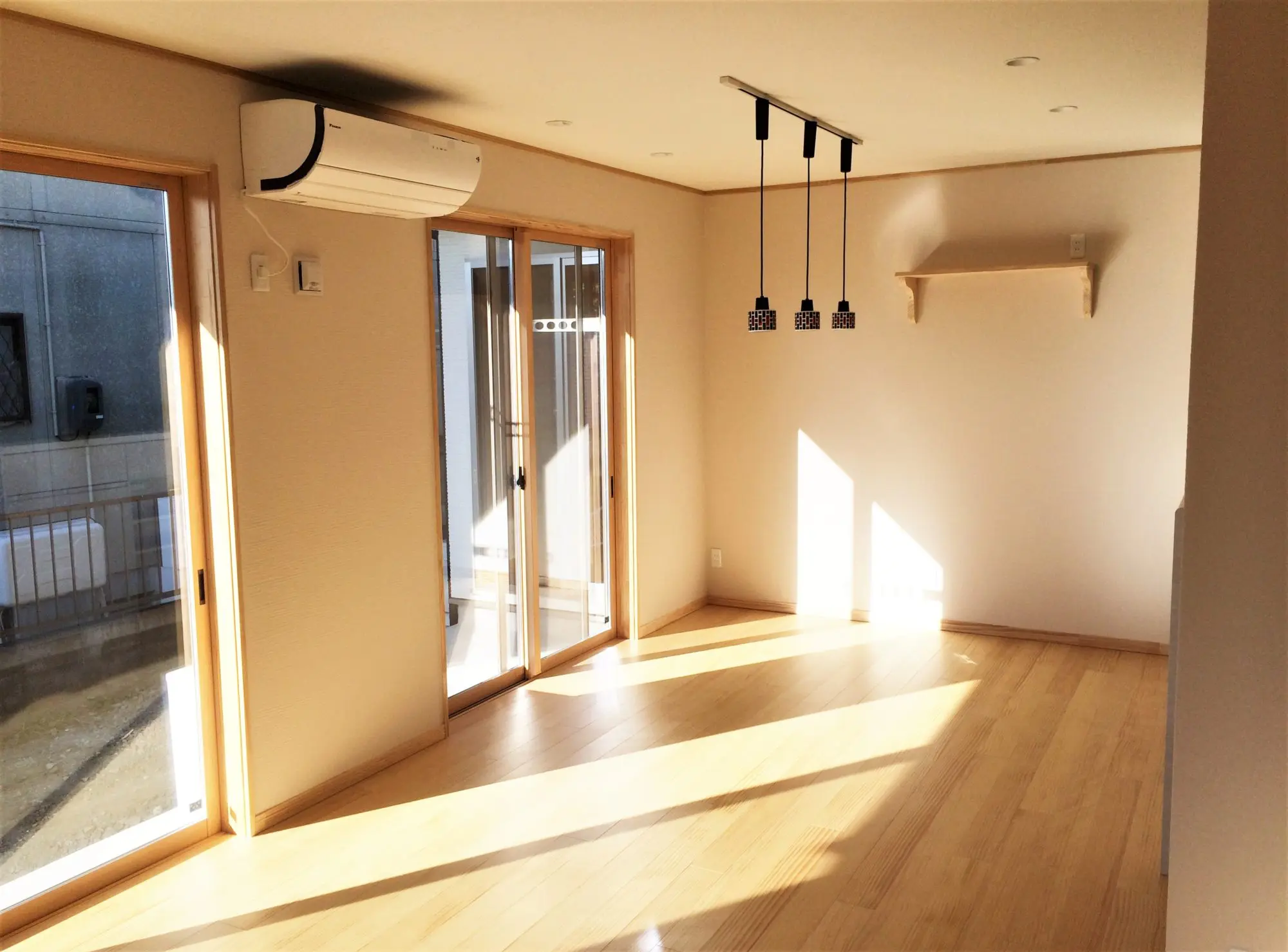 南向きの窓から陽射しがたっぷり差し込むLDKは、白を基調にした内装と無垢のフローリングが心地よい空間を演出。家族の集う場所にぴったりな温もりあるリビングです。