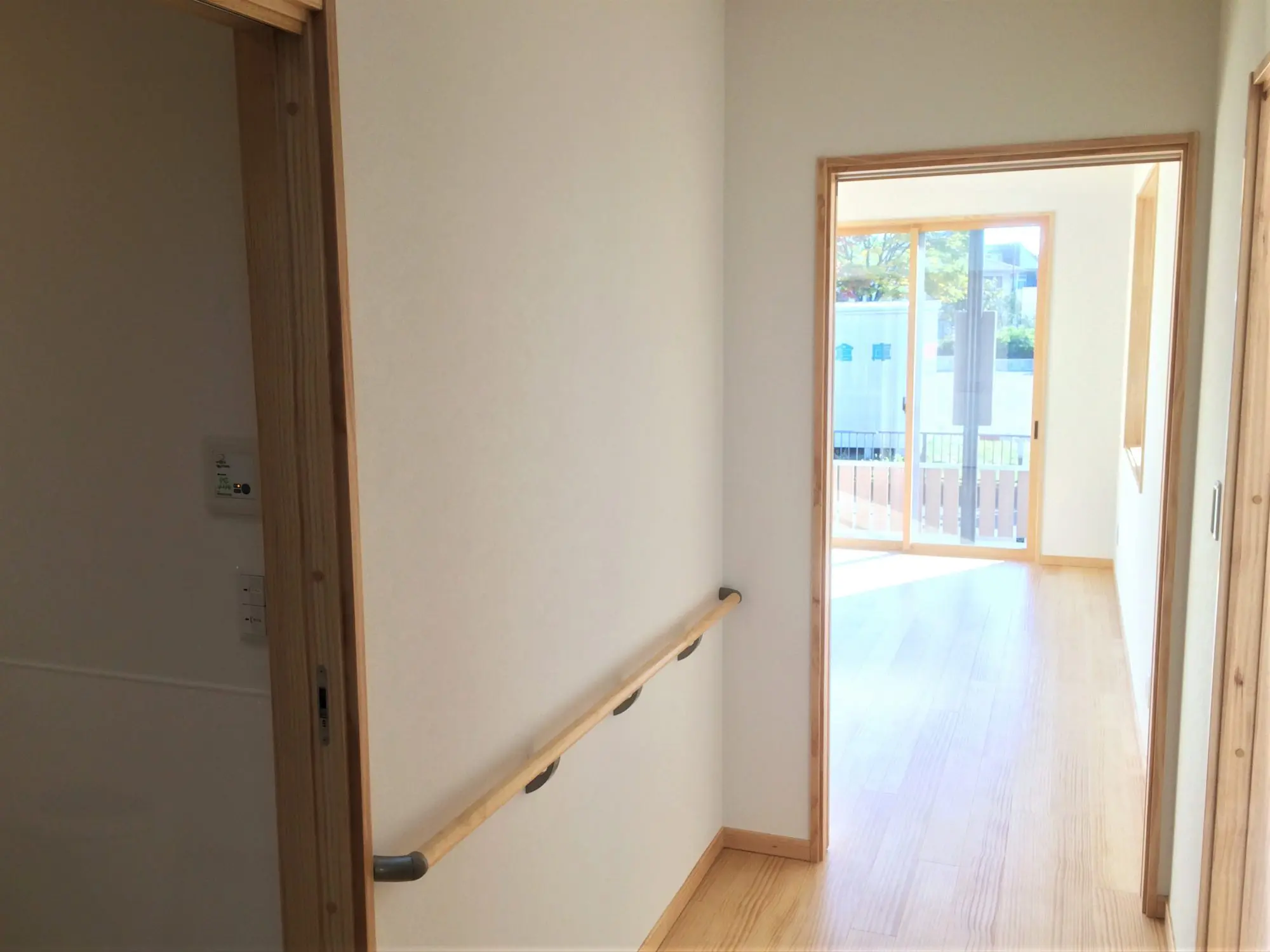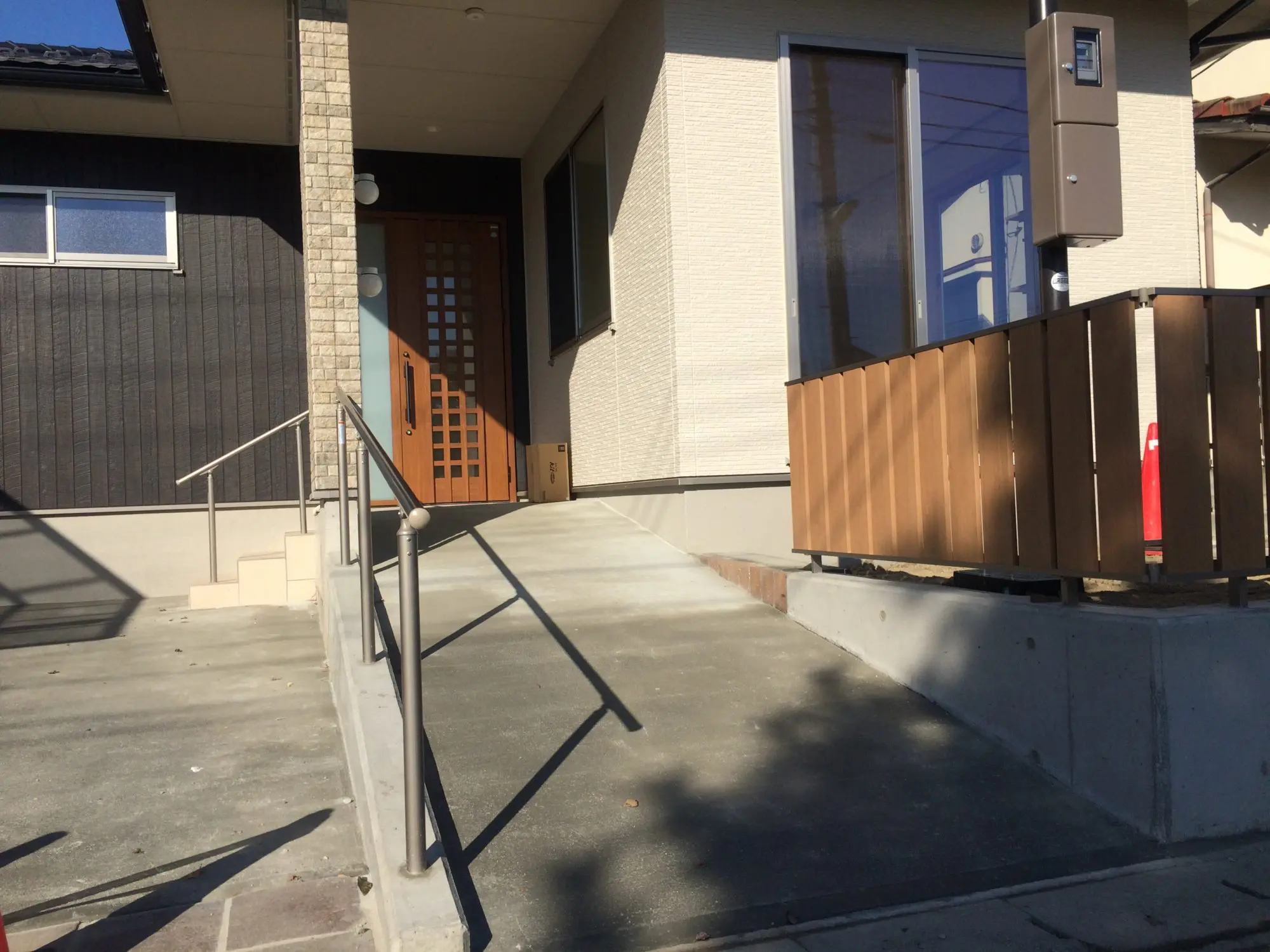 駐車場から玄関まで段差のないスロープを設置し、手すりも完備。雨の日でも滑りにくい素材で、車椅子やベビーカーの出入りも安心な設計にしています。