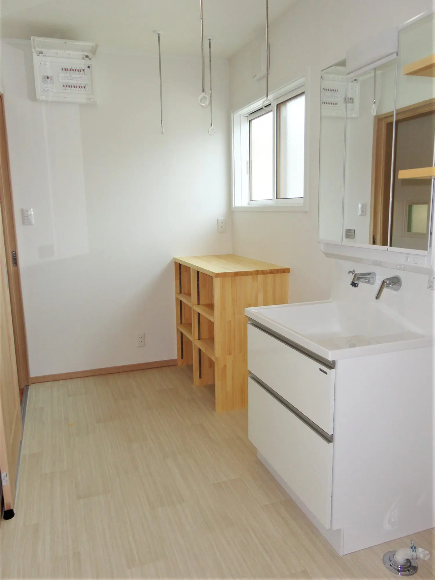 洗面脱衣室やキッチンまわりには、造作棚や収納スペースをしっかりと確保。動線もコンパクトにまとめ、日々の家事をサポートする間取りになっています。