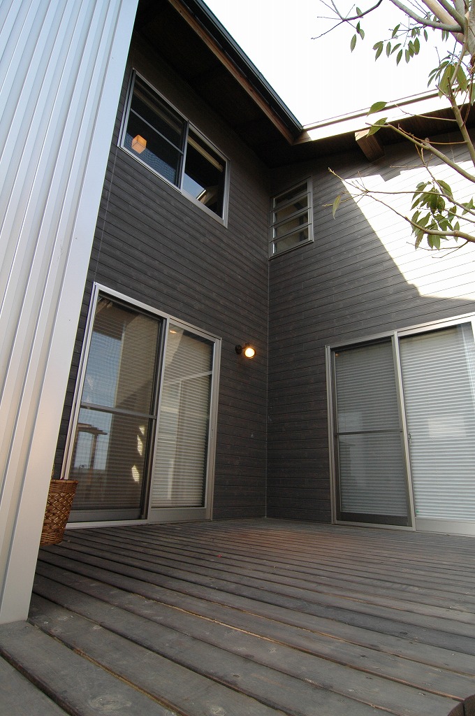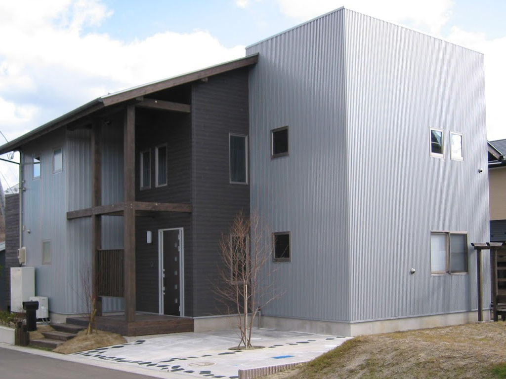 外観は金属サイディングと木目を組み合わせた、和モダンなファサードに。道路からの視線を自然に遮る配置計画で、安心感のある暮らしが叶います。