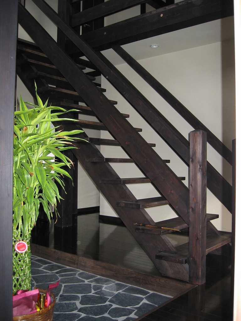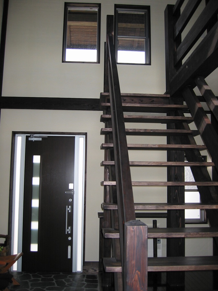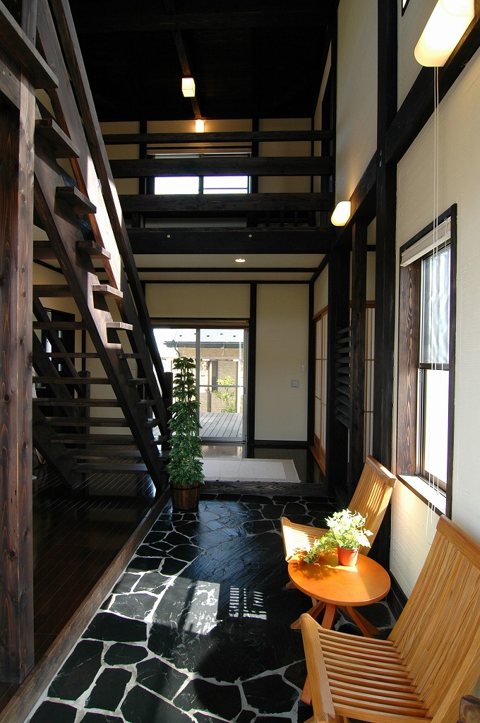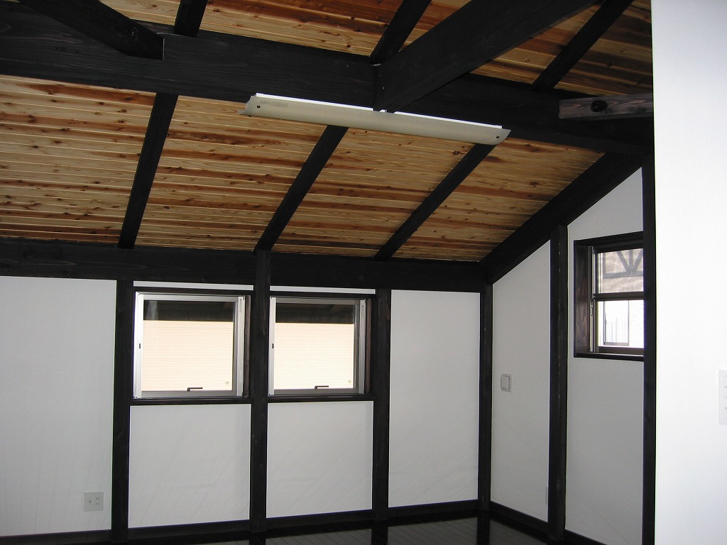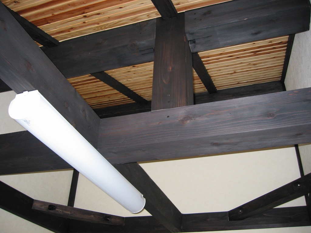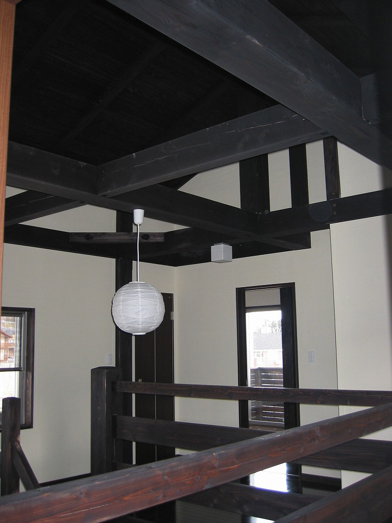 重厚感ある構造美。深い色の梁と吹抜けが生む開放感